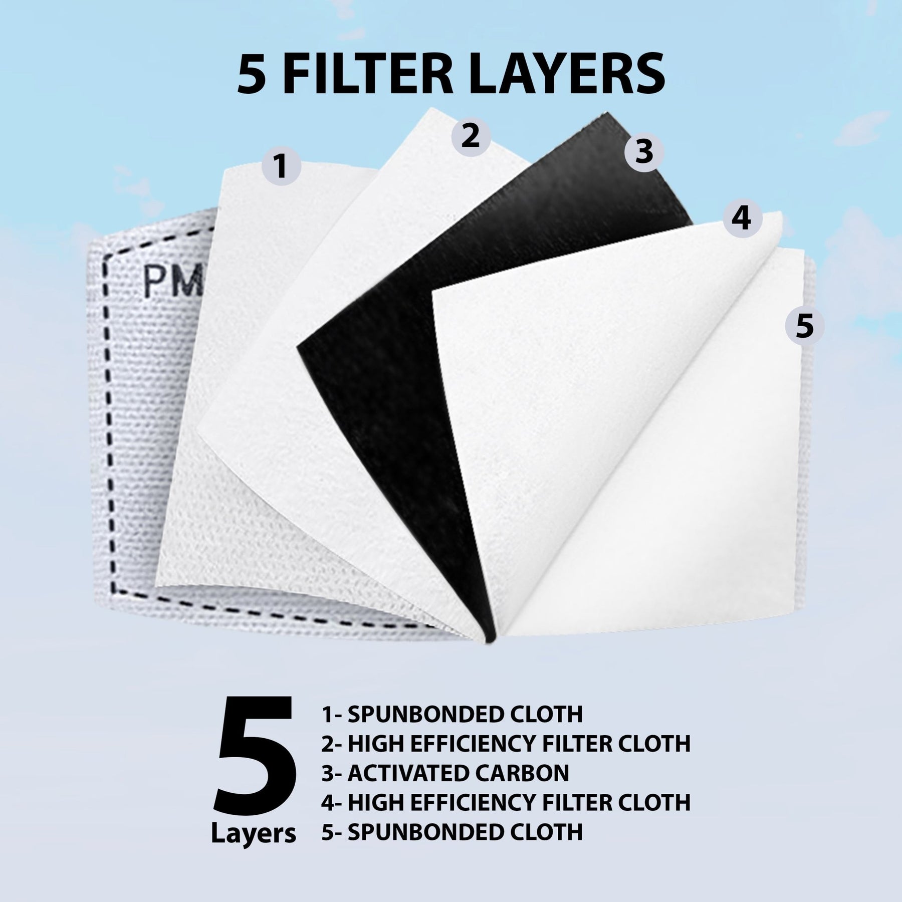 Multi-Stage Filtration System Each filter is constructed with 5 distinct layers, including activated carbon and non-woven melt-blown fabric. This system effectively blocks PM2.5 particles, dust, haze, vehicle exhaust, pollen, and industrial fumes, making it ideal for commuting, gardening, woodworking, or daily commutes.