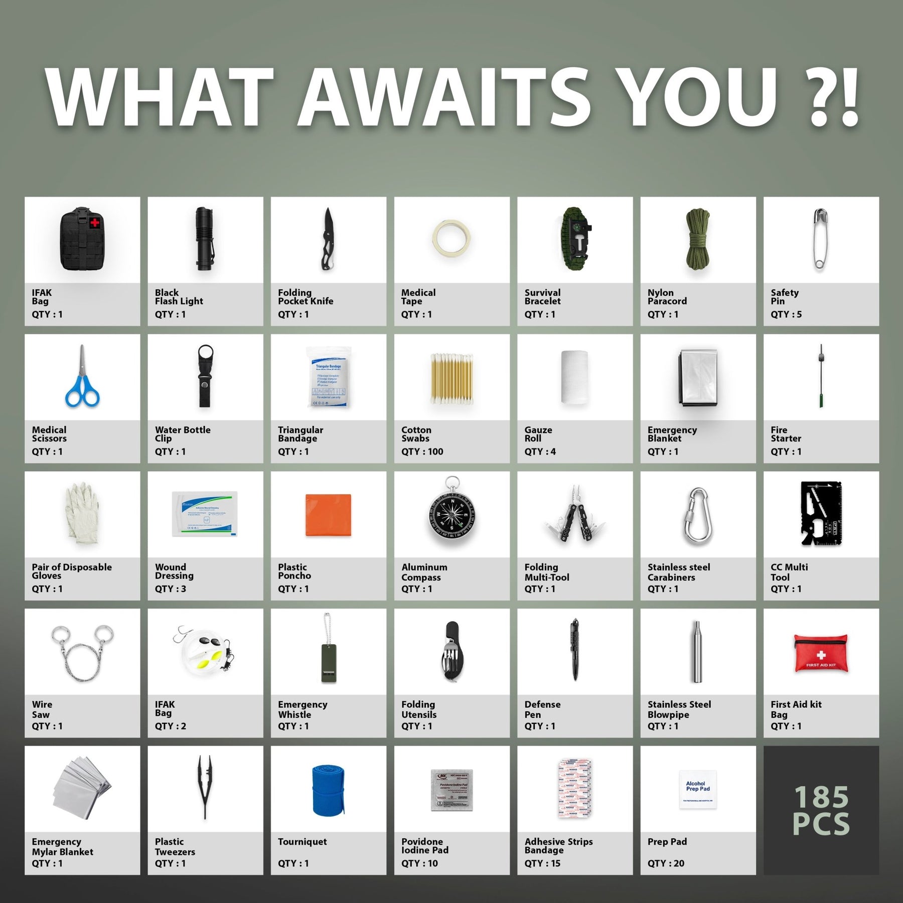 Total Preparedness Ready yourself for any emergency with the ASA Techmed 185-Piece Survival Kit. Whether for hiking, camping, or disaster prep, this upgraded set packs professional-grade tools and critical medical supplies into one compact, water-resistant Molle IFAK Pouch.