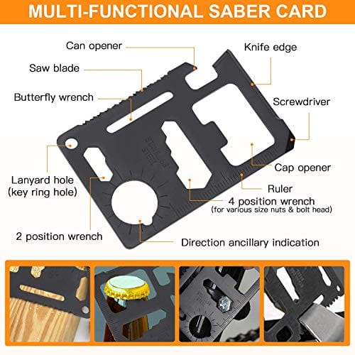 ✅ Survival Tools: Knife, Flashlight, Paracord, Saber Card & more.