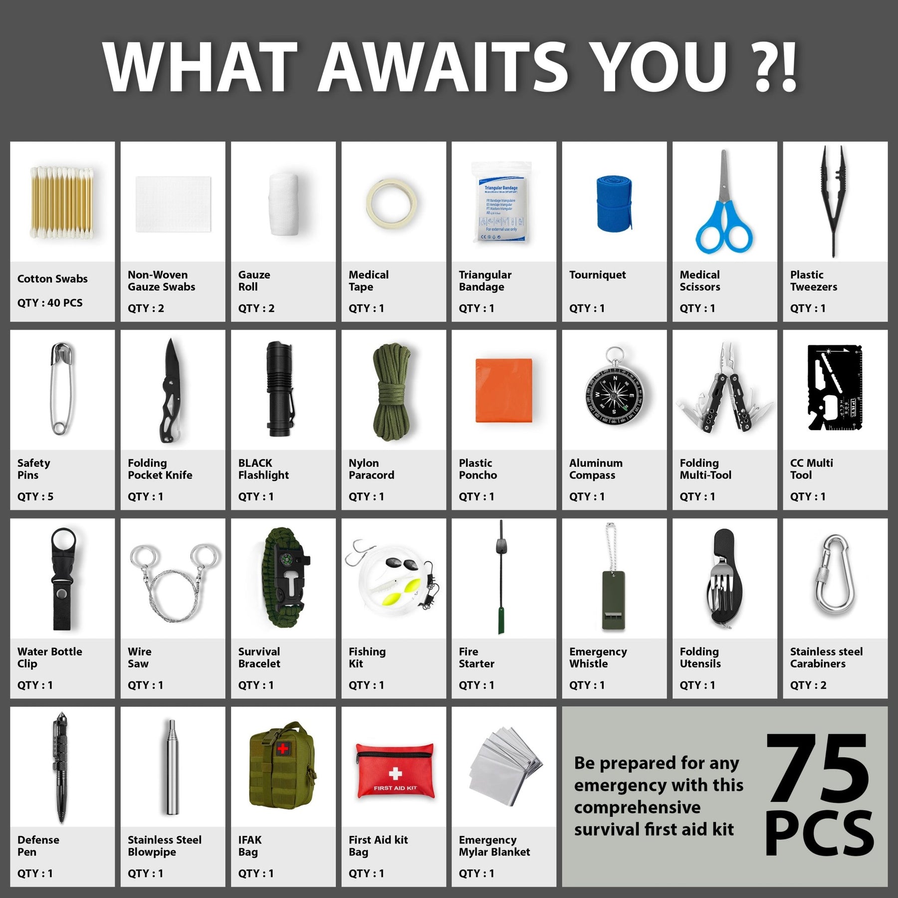 75-Piece Set: Complete trauma and survival solution.