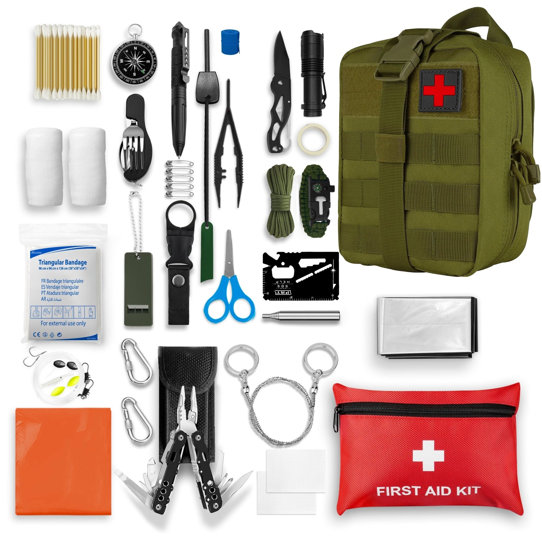 Survival Essentials Beyond medical care, this kit equips you for survival. It is packed with high-value gear including a folding knife, multi-tool, fire starter, flashlight, and compass. All 75 items are organized in a rugged Molle-compatible pouch that attaches easily to backpacks, vests, or belts for hands-free portability.