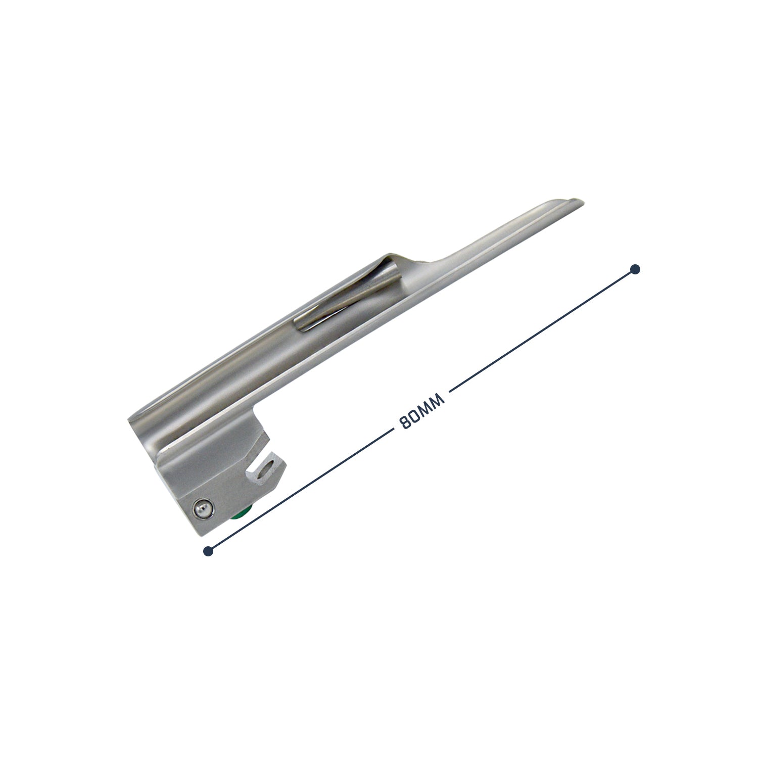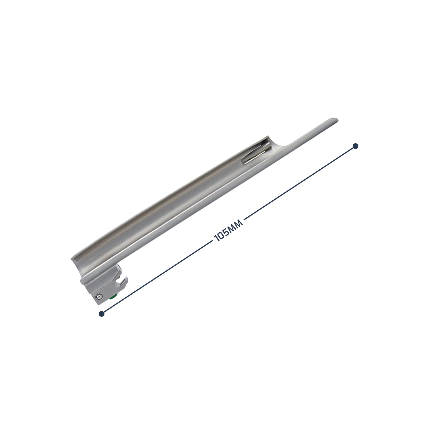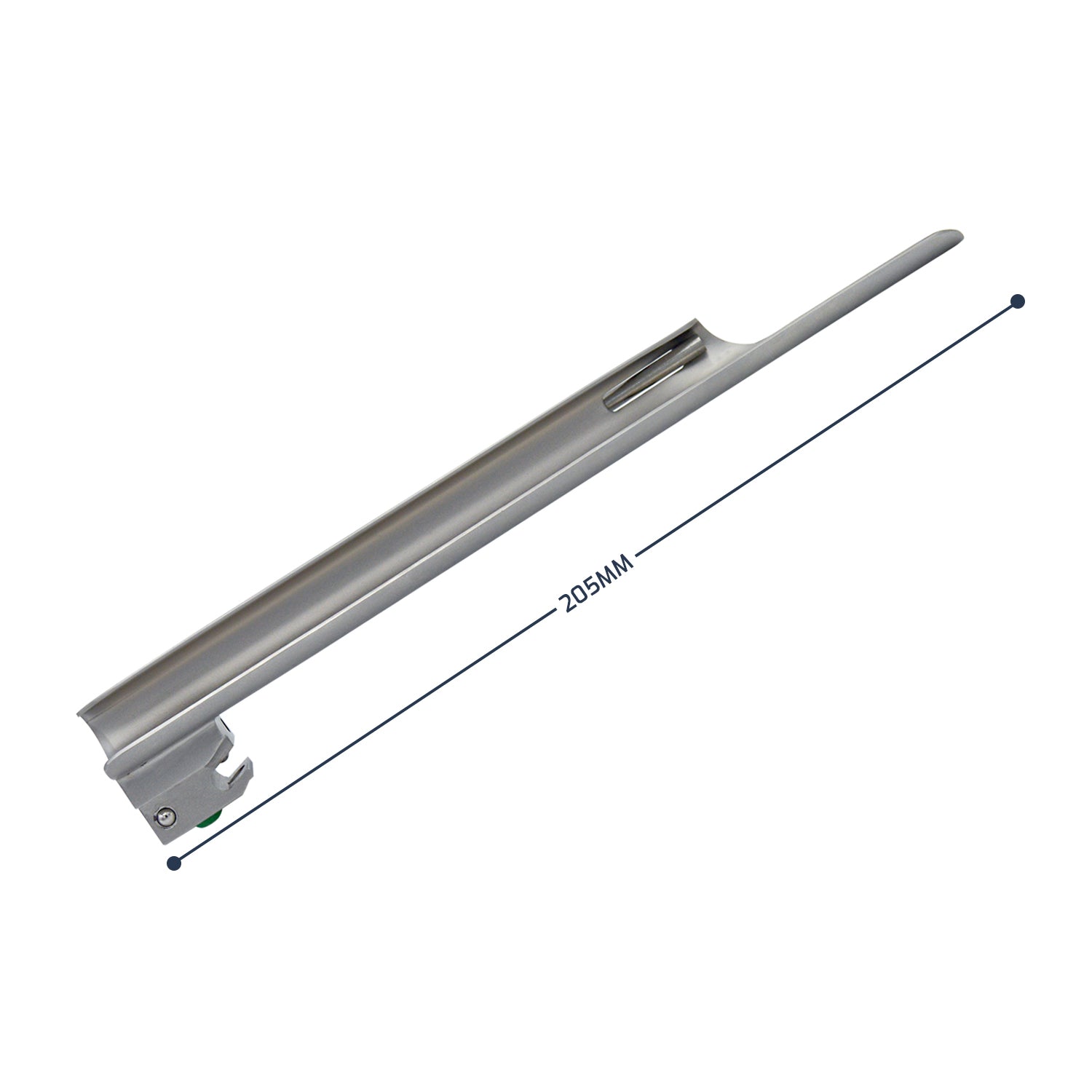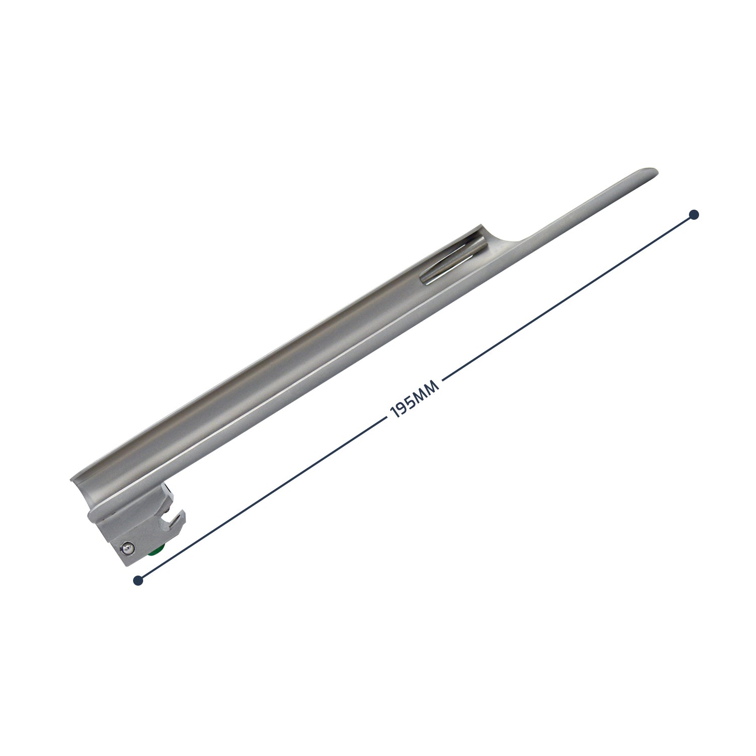 A side view of a Miller laryngoscope blade, displaying the straight design and the green color-coded heel.