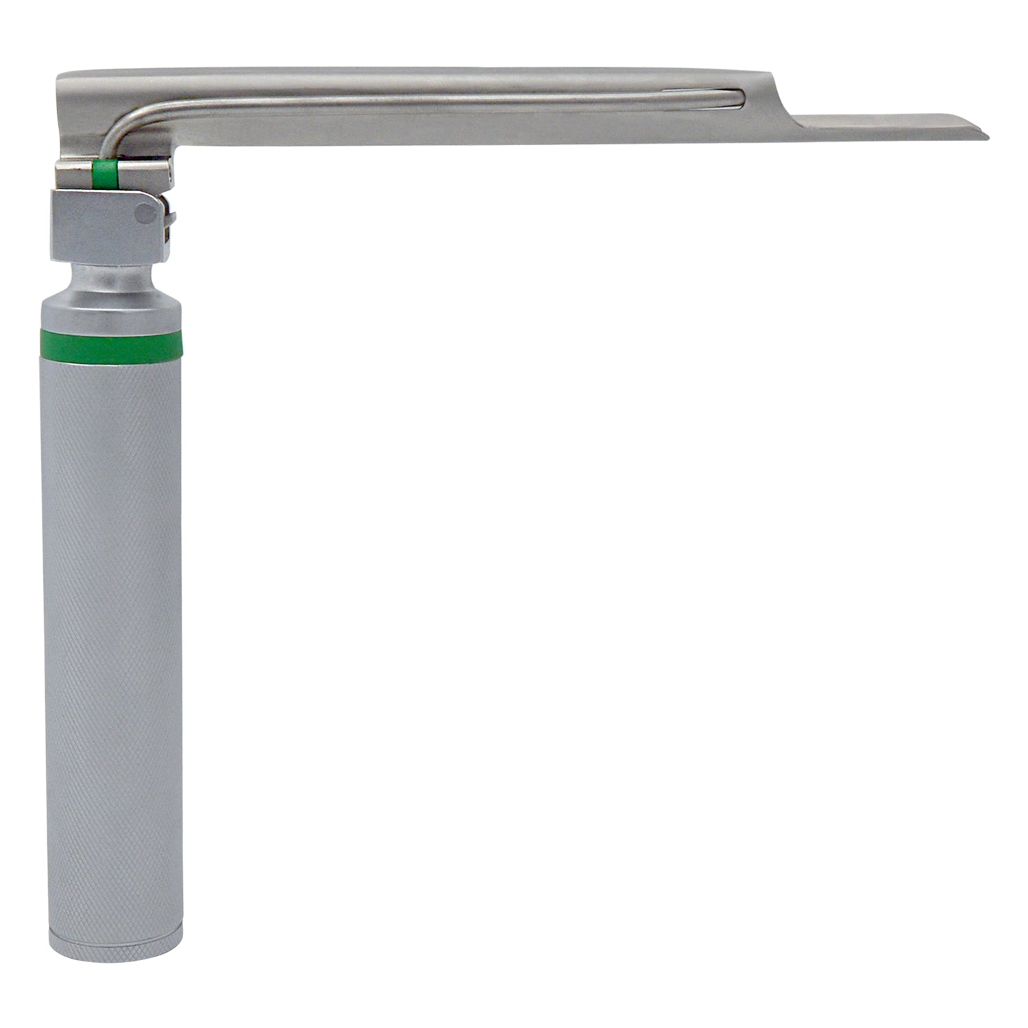 An angled view of an assembled fiber optic laryngoscope consisting of a silver knurled handle with a green ring and an attached straight Miller blade.