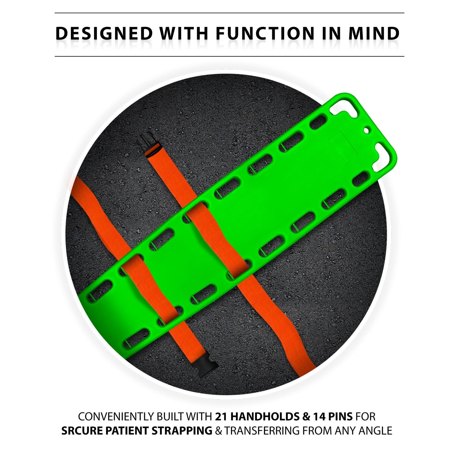 Ergonomic Transport Protect both the patient and the rescuer. The board features 21 handholds and 14 pins for versatile strapping and lifting from any angle. This design prevents lower back stress for personnel while ensuring the patient remains secure during transfer.